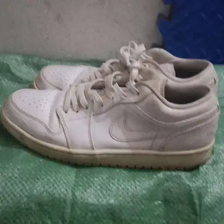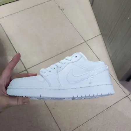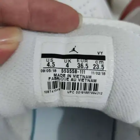 For the Jordan Air Jordan 1 Vintage Basketball Shoes in White/Gray, check the quality of the synthetic leather and rubber sole. Authentic shoes will have a sturdy construction with no signs of glue or uneven seams. The color scheme should be consistent with official images.