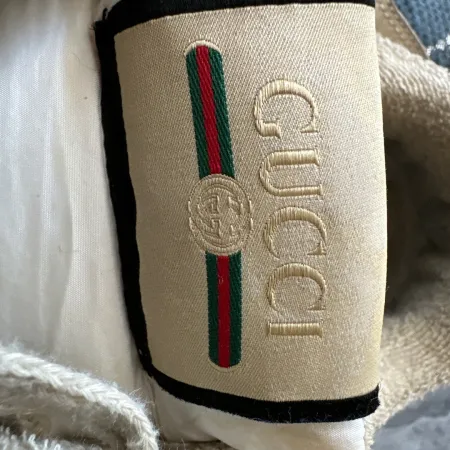The label on this model should include the style ID '756478 0YIA0 9547'. Ensure it is stitched in place and not peeling off. The font should match other authentic GUCCI products, and the care instructions should be clear. Any discrepancies can be a sign of a fake.