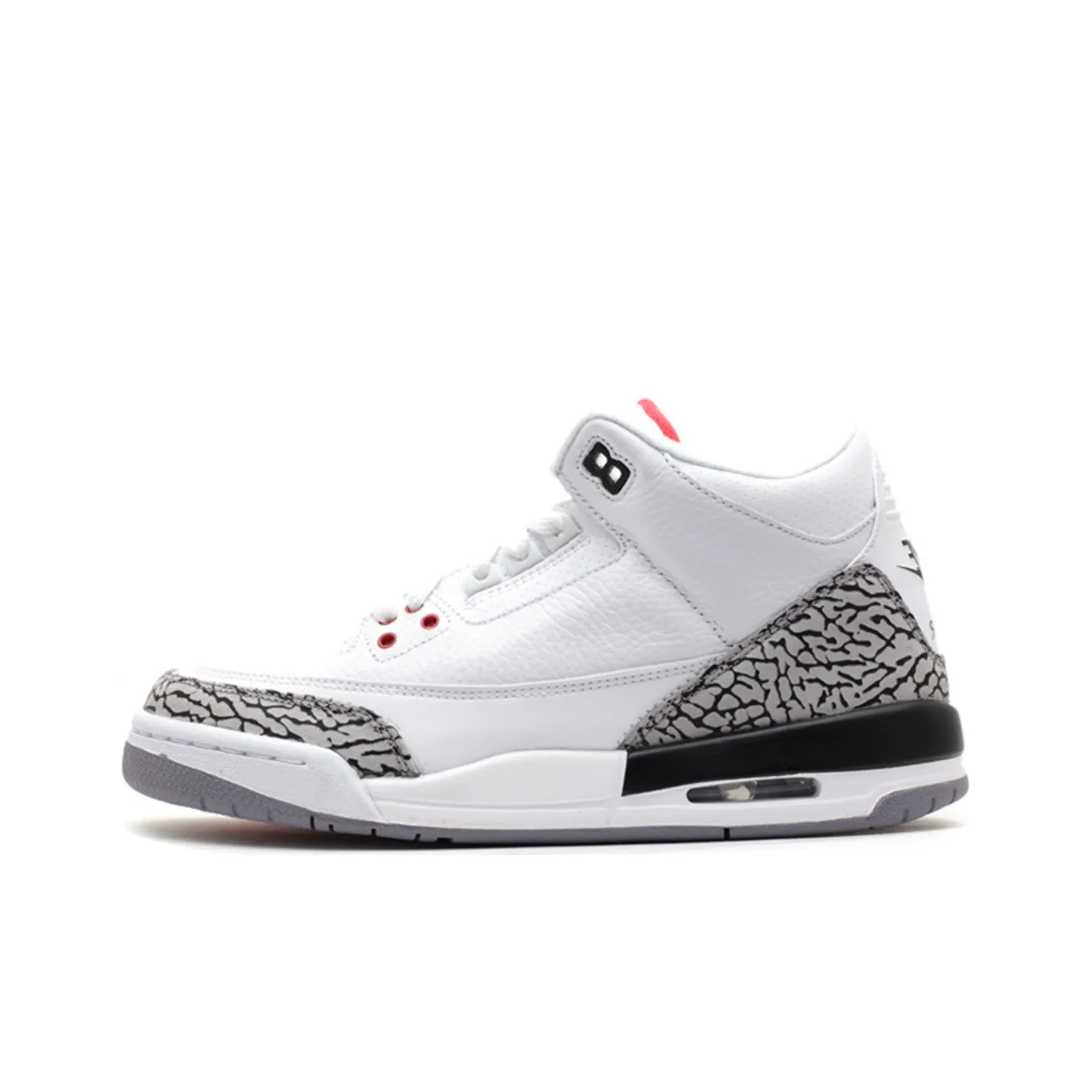 To authenticate the Air Jordan 3 Retro '88' 2013, focus on the shoe's overall appearance. The color scheme should be a classic white with Fire Red and Concrete Gray accents. The elephant print should be distinct and well-defined, with no fading. Authentic pairs will have a sturdy construction, and the rubber sole should exhibit the right amount of flexibility without being overly soft.