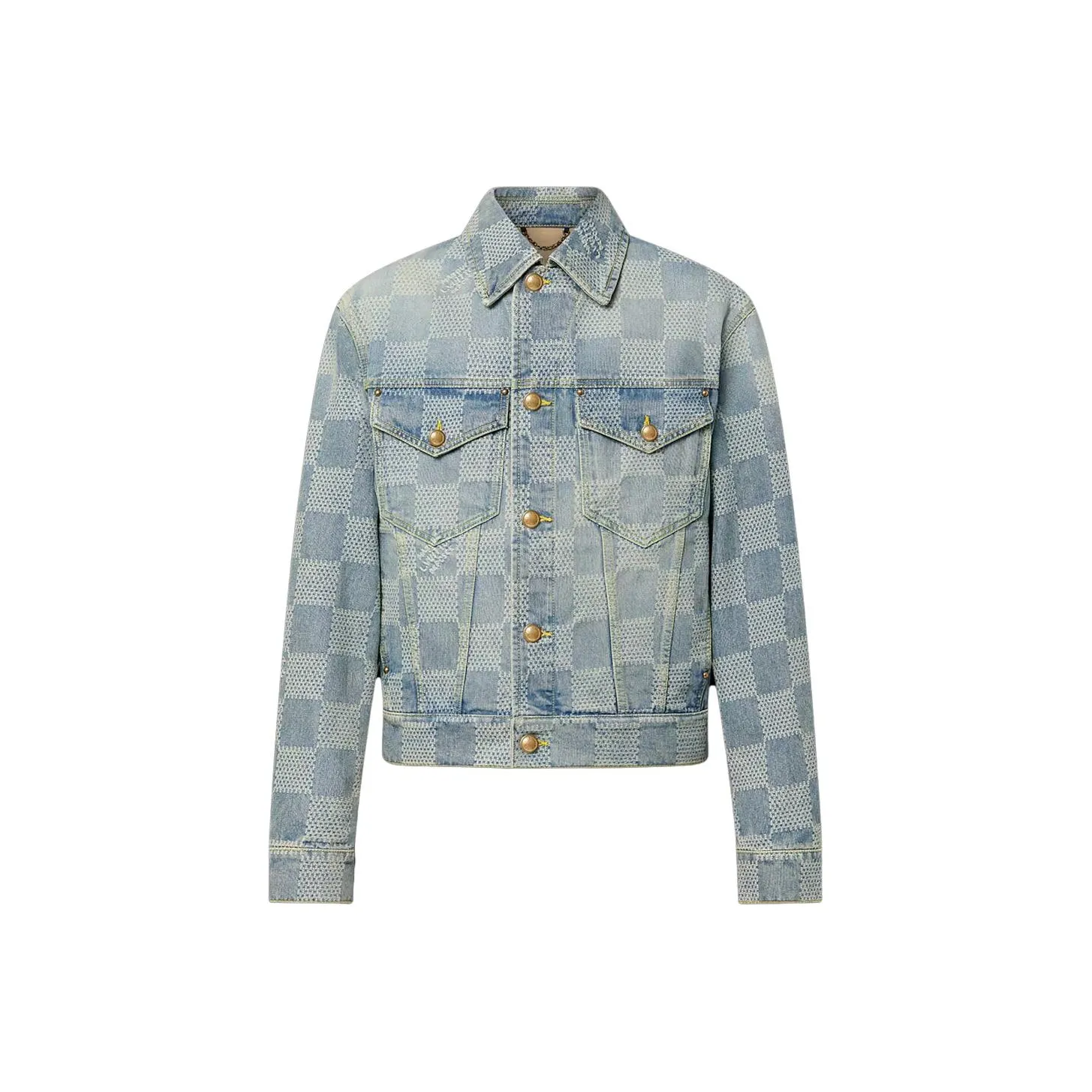 To identify the authenticity of the LOUIS VUITTON Damier Classic Denim Jacket, examine the fabric and pattern. Authentic jackets have a moderate thickness and a well-defined plaid pattern. The stitching should be even, with no loose threads or imperfections.