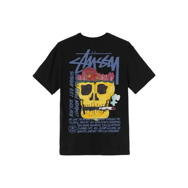 To verify the authenticity of the Stussy T-shirt, inspect the letter and skeleton patterns for quality. Authentic items will have clean, precise prints without any blurring. The fabric should feel soft yet robust, and the overall fit should be true to size, reflecting the brand's standard.