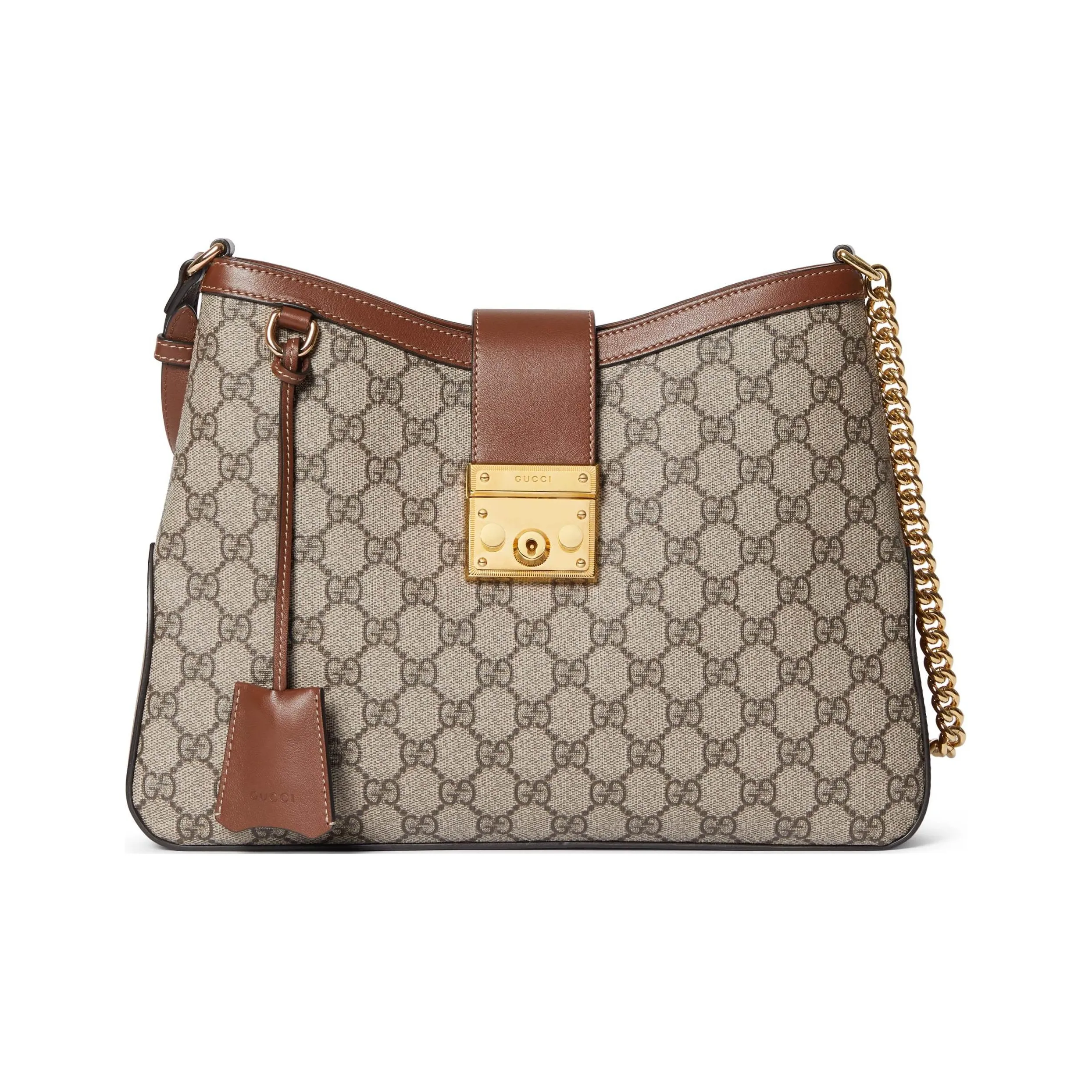 For the GUCCI Padlock Shoulder Bag, inspect the overall design and materials. The canvas should be durable and the print should be sharp and clear. Authentic bags will have consistent color and texture, with no signs of wear or fading. The lock should function smoothly and be engraved with the GUCCI logo.