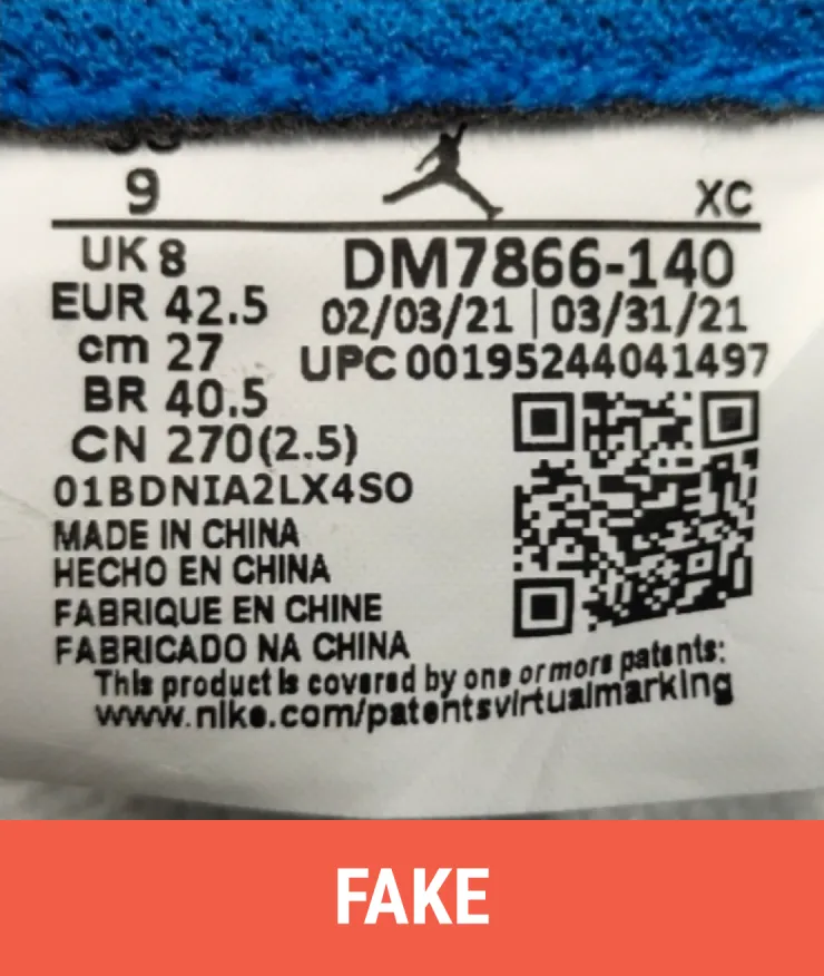 Fake: The material of the shoe label appears overly whitened. The Jumpman logo has deformed contours and appears bulky. The fonts of the letters and numbers on it are relatively thicker and the layout is incorrect.