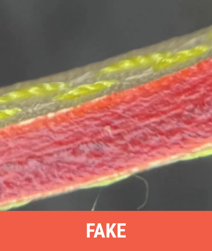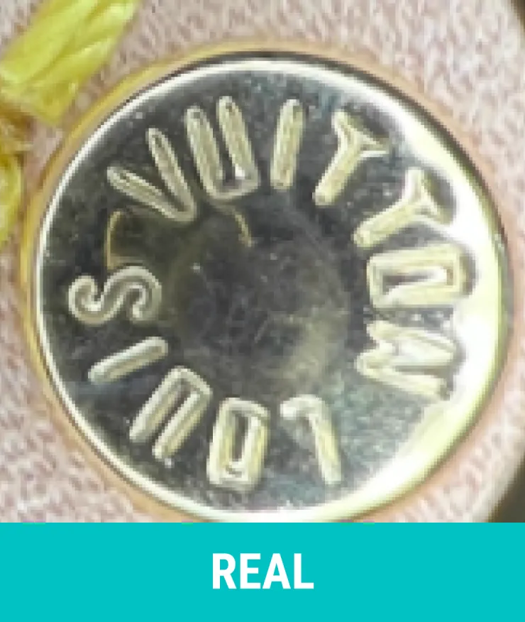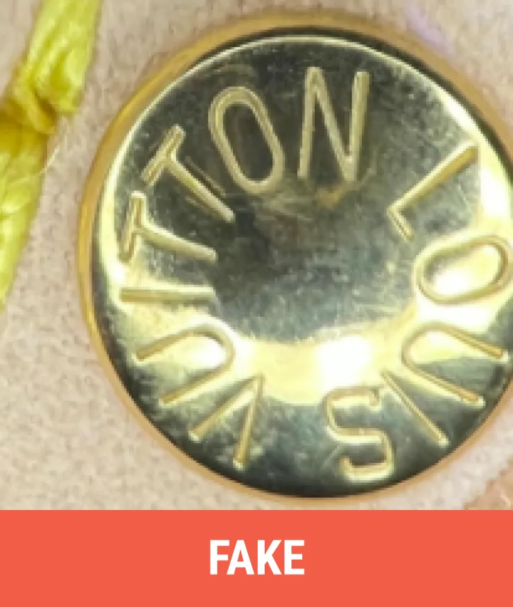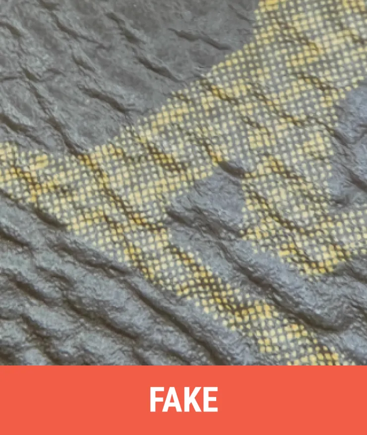 FAKE: In the monogram area, under magnification, the surface texture shows inconsistent grain sizes, looser, and unevenly distributed.