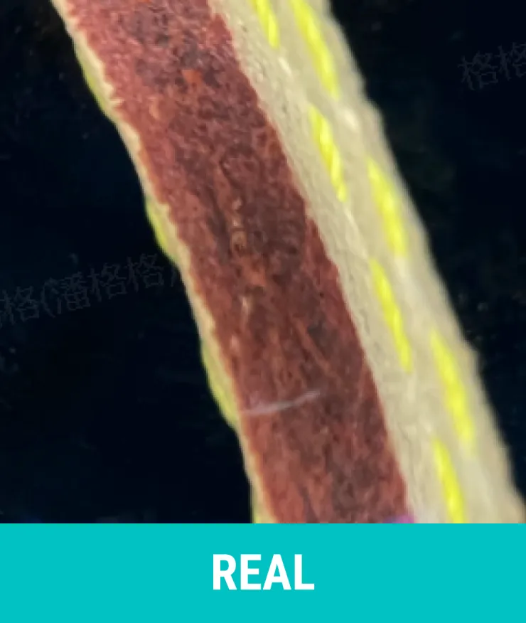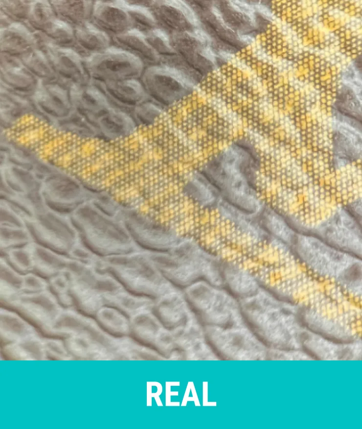 REAL: In the monogram area, the surface texture features consistent grain size, tightly packed, and evenly distributed.