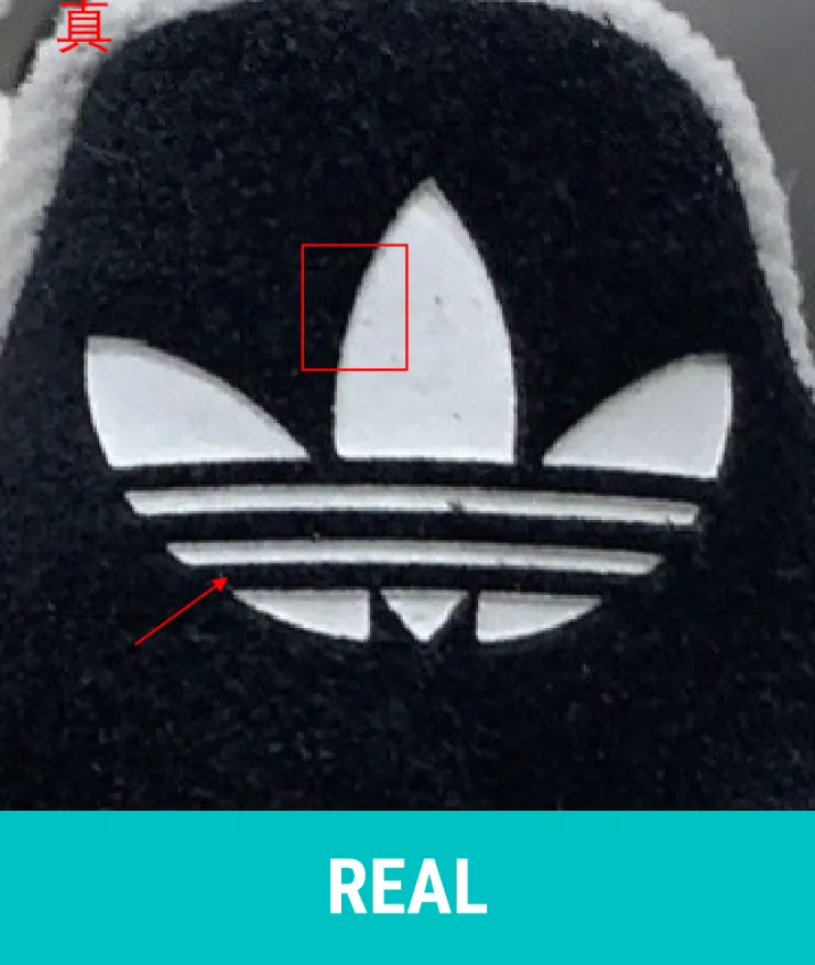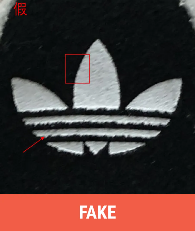FAKE: The heel logo is applied lightly, the print is smudged, with rough edges.
