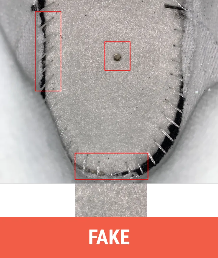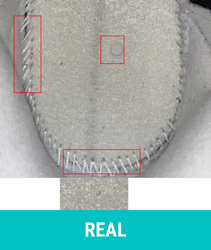 FAKE: The color of the midsole material is relatively white, the left midsole stitching is loose with a large spacing, the ones at the heel are messy, the positioning hole is small.