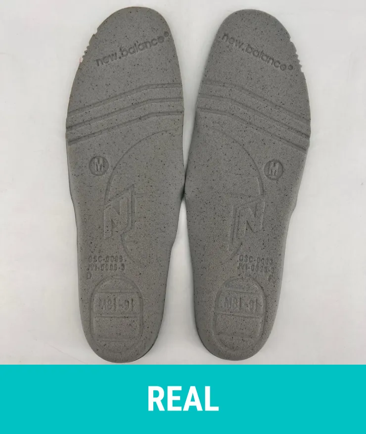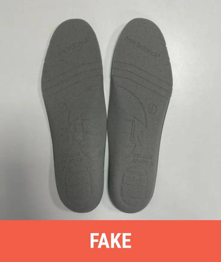 Fake: The N logo in the middle is lower on the left and higher on the right for the left foot, but higher on the left and lower on the right for the right foot.