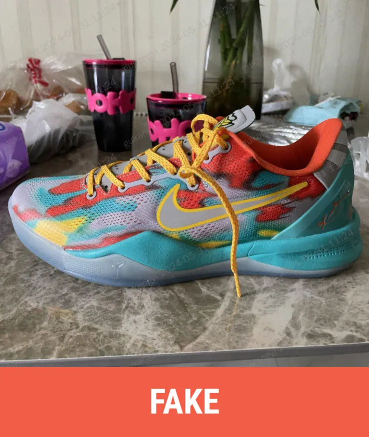 Real: The shoe upper color is lighter, and the SWOOSH logo is higher.