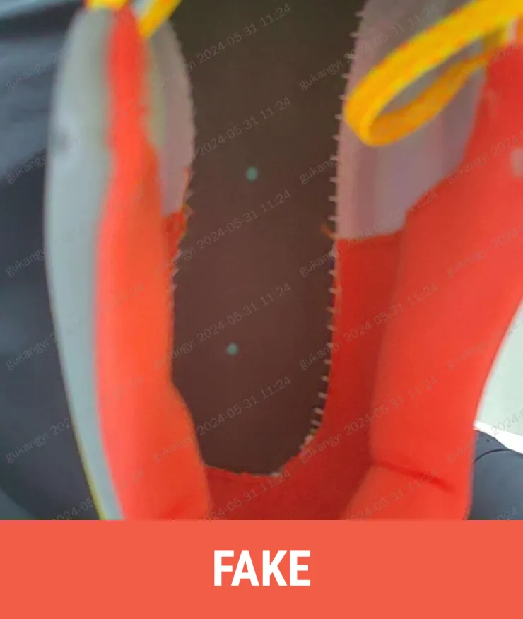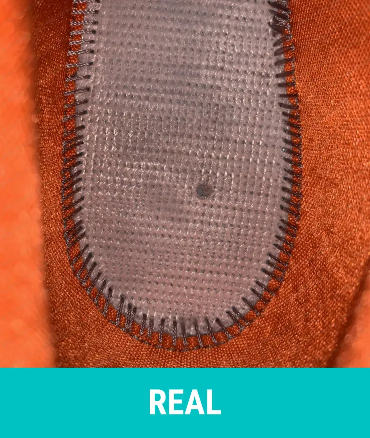 Real: The midsole material is woven fabric with a longer stitching line along the collar, and the needle holes are more to the right.
