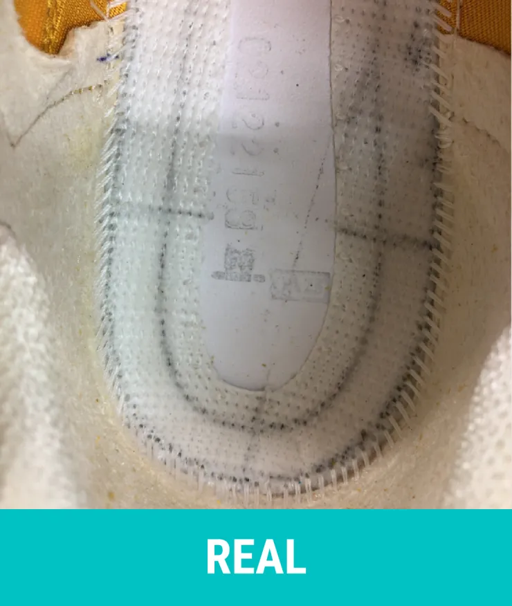 Fake: The upper has noticeable reflection, the tension is low and the stitching is loose, the non-woven fabric appears white, and the internal cutting shape is irregular.