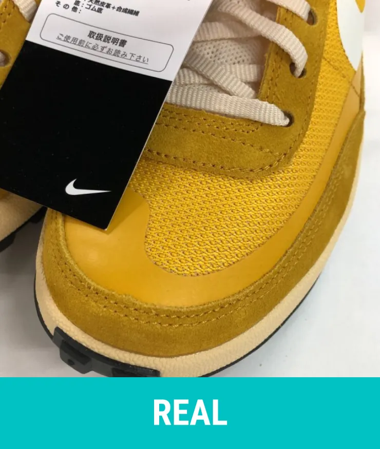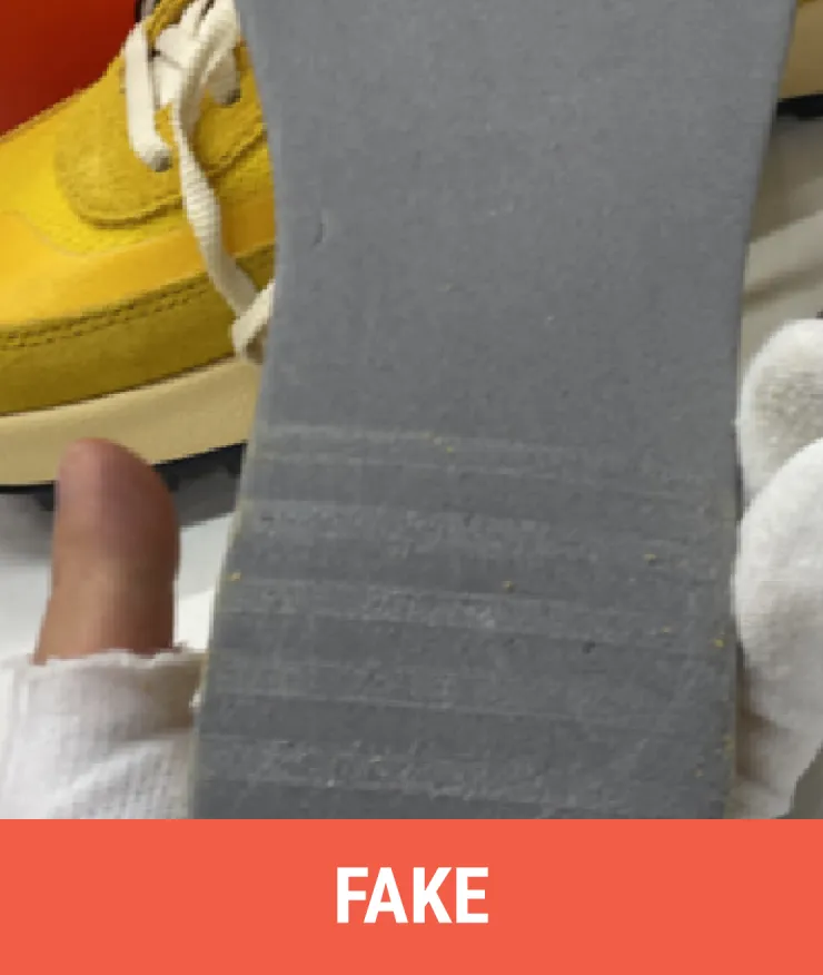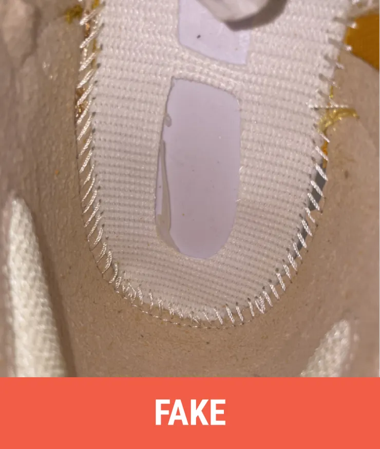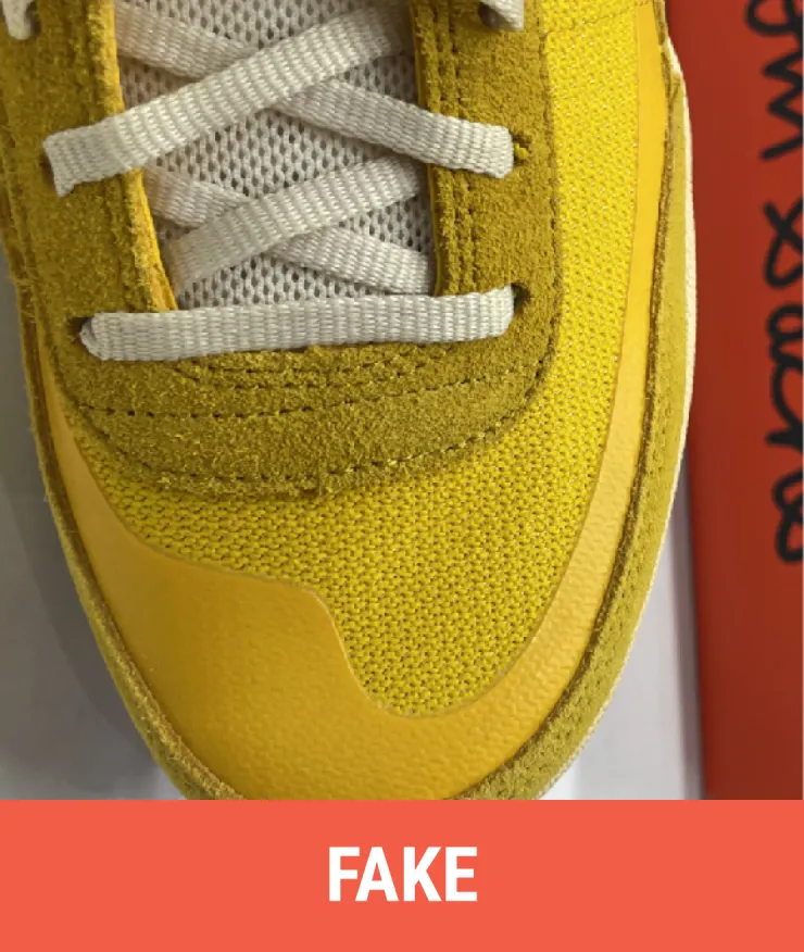 Fake: The yellow is dark and muted, and there is a noticeable color difference between the TPU on the shoe upper and the fabric.